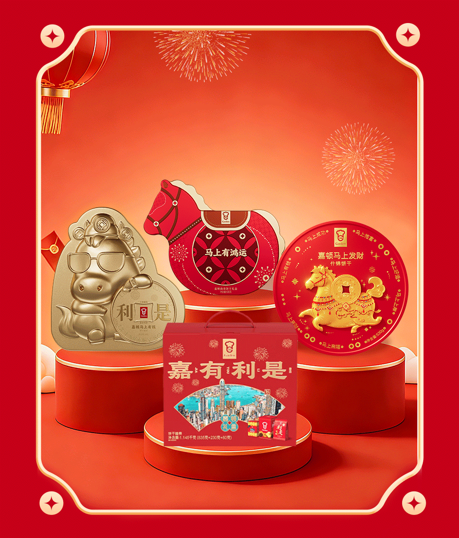 在99年经典传承之上,嘉顿紧扣“骐骥送福”的马年寓意,推出多款代言人佘诗曼同款CNY新年礼盒,让国民记忆中的美味与新春祝福深度绑定。礼盒设计暗藏生意洞察:马年限定主题礼盒推出“马上有钱”“马上发财”“马上有鸿运”三款精美罐装产品,融入金马、红马生肖元素,精准击中年节送礼的仪式感需求。