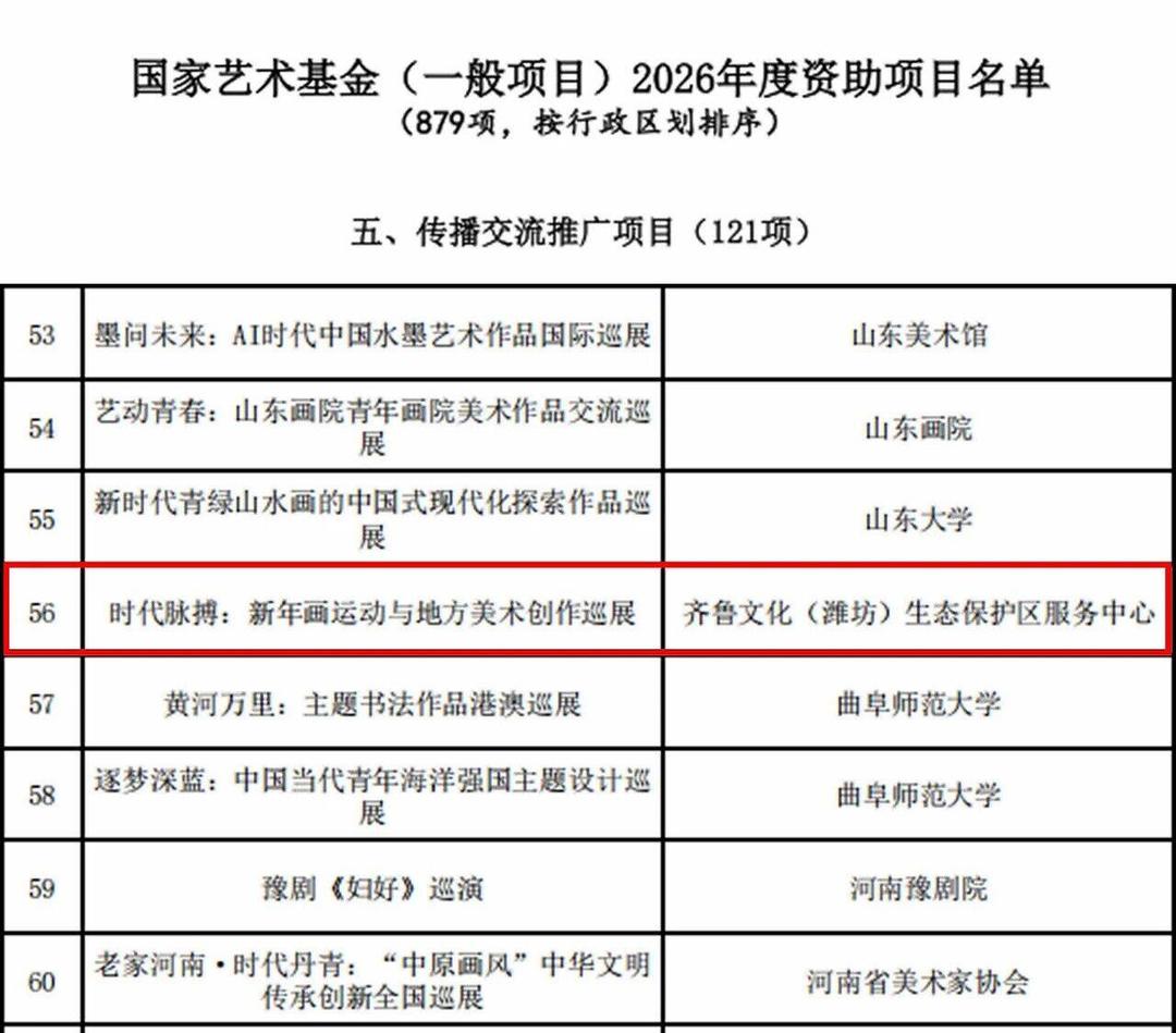 近日,国家艺术基金(一般项目)2026年度资助项目立项名单公布,齐鲁文化(潍坊)生态保护区服务中心申报的展览项目时代脉搏——新年画运动与地方美术创作成功入选传播交流推广资助项目。这是2026年度绘画、雕塑、书法、篆刻、摄影和工艺美术作品展览类项目中唯一一个入选的地市级项目,标志着潍坊市在相关美术领域的研究、策划与推广能力获得了国家级层面的认可。